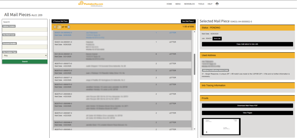 Mail tracing is just one of the benefits of using Postalocity to send your mailings. Once your jobs are sent, there are several different ways to trace a mailing. Tracing can be done by opening the Job Details of a mailing to see the tracking status of all pieces in the mailing. You can find more details about this in Easily Track Mail Without Added Cost!